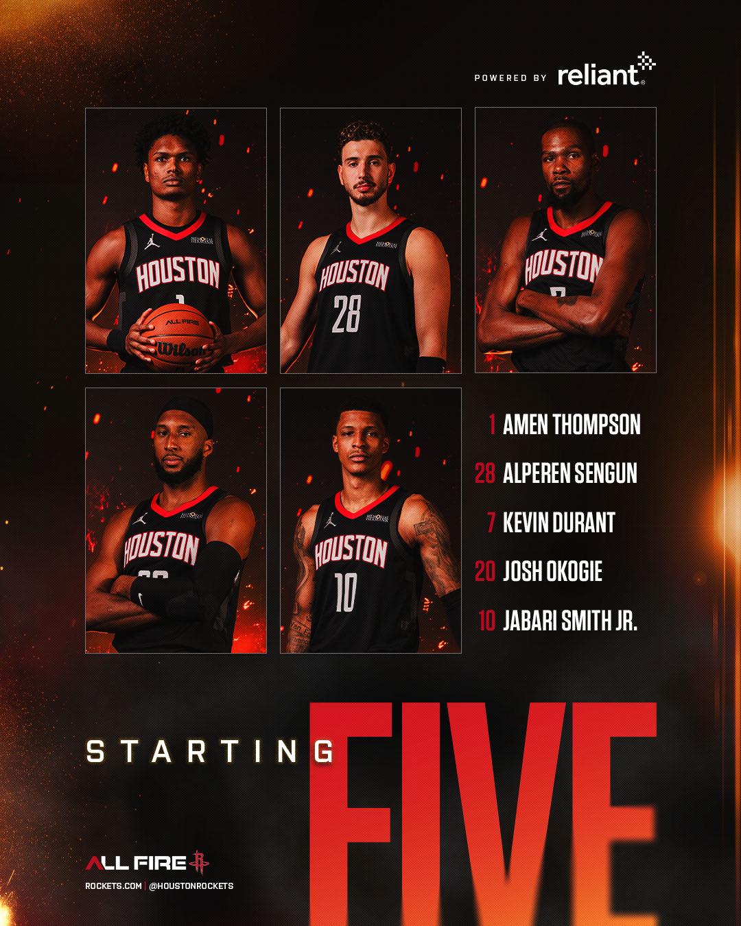 赛前,流言兰特火箭社媒公布本场比赛的首发球员:凯文-杜兰特、阿尔佩伦-申京、阿门-汤普森、小贾巴里-史密斯、约什-奥科吉。