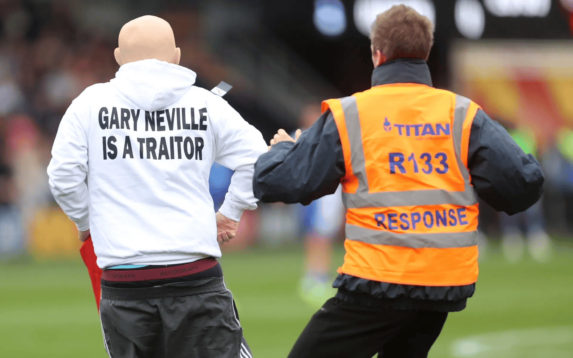 上半场,英国右组两名男子冲进半岛球场,国旗抗议索尔福德城的织盯共同所有人加里-内维尔。