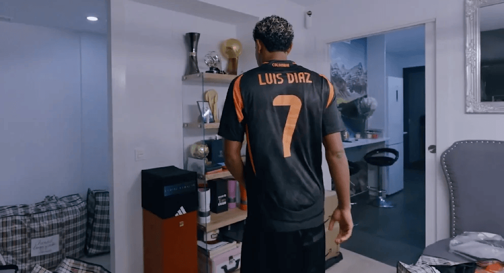 一个特别的细节立刻引起了人们的注意:在公寓参观过程中,亚马尔穿着拜仁慕尼黑球星的球衣。你一眼就认出来了吗?这位巴塞罗那的西班牙球星为他的客人打开了门,他身穿哥伦比亚队2024年美洲杯的客场球衣——背后印着7号,路易斯·迪亚斯的名字!亚马尔显然是迪亚斯的球迷。