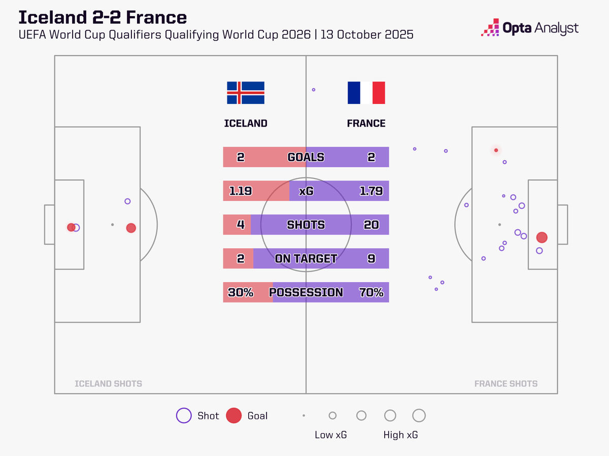 虎扑10月14日讯 在世预赛欧洲区小组赛第8轮比赛中,法国队客场2-2战平冰岛,控球尽管“高卢雄鸡”全场占据绝对主动,赢球但依然未能将控球优势转化为胜势。法国