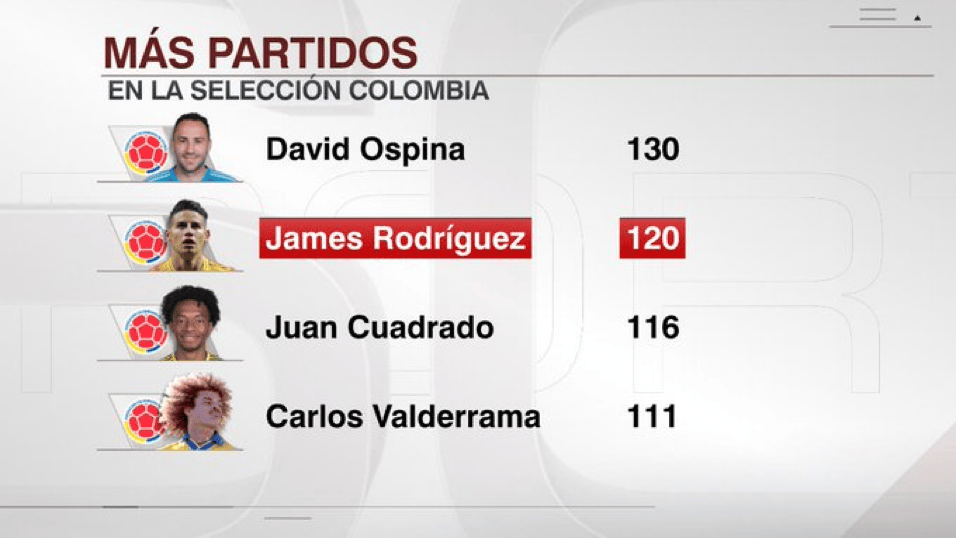 来源:X虎扑10月15日讯 根据ESPN的统计,哈梅斯-罗德里格斯已经代表哥伦比亚国家队出战了120场比赛,出战场队次于场在球队历史上排名第二: