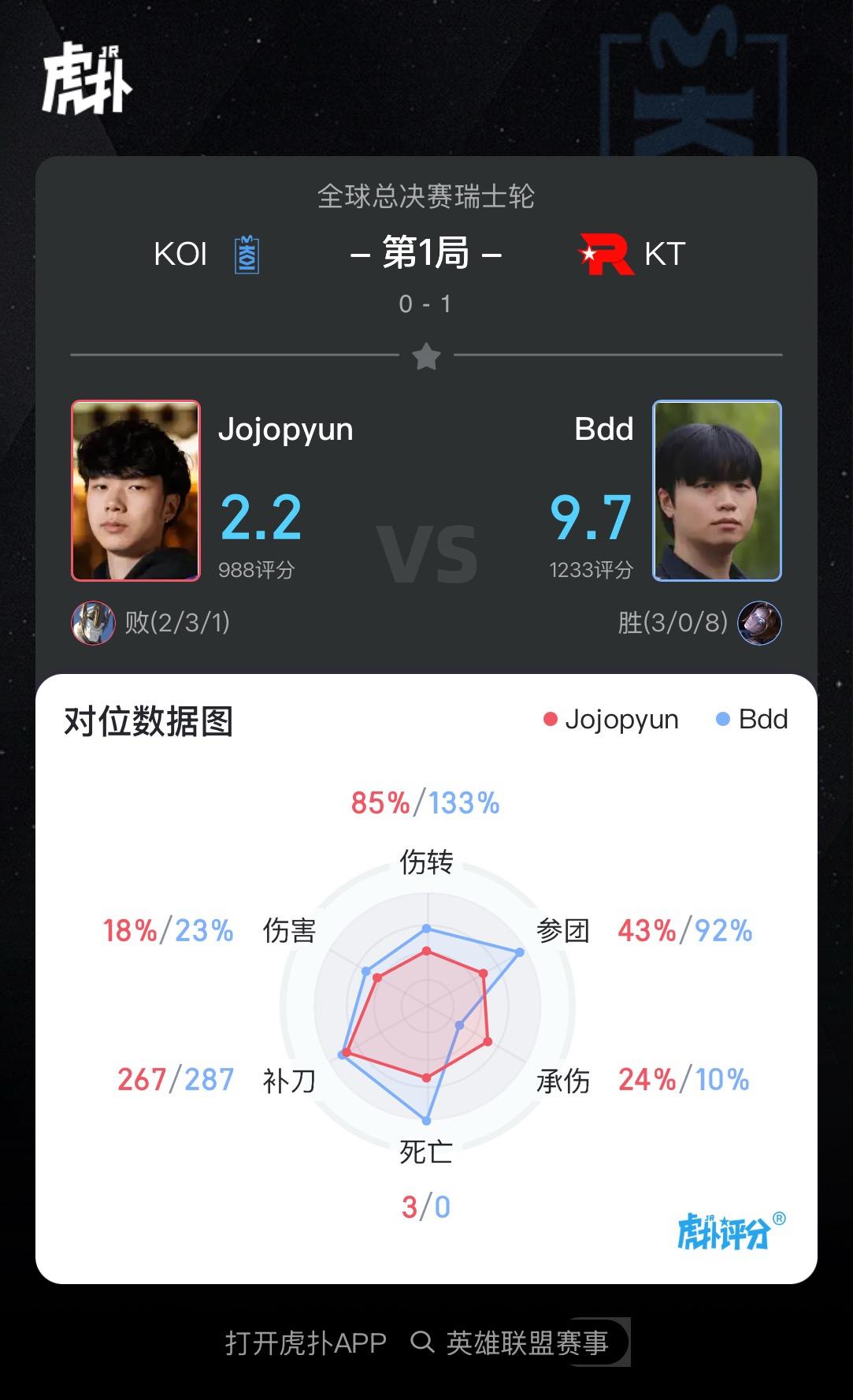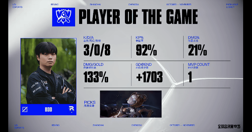 虎扑10月15日讯 在刚刚结束的KT对阵KOI比赛中,BDD发条打出3/0/8战绩,打出对阵I对拿下KT对阵KOI对局MVP。战绩