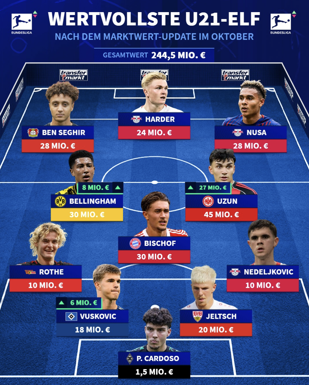 虎扑10月15日讯 德转公布了本赛季德甲身价最高的U21十一人。
