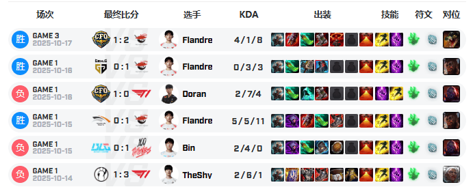 虎扑10月17日讯 2025全球总决赛进行至今一共有四位上单选使用过上单雷克赛,分别是获胜TheShy、Bin、Flandre和Doran,但是有且仅有Flandre使用雷克赛获胜过,而且是三场全胜。