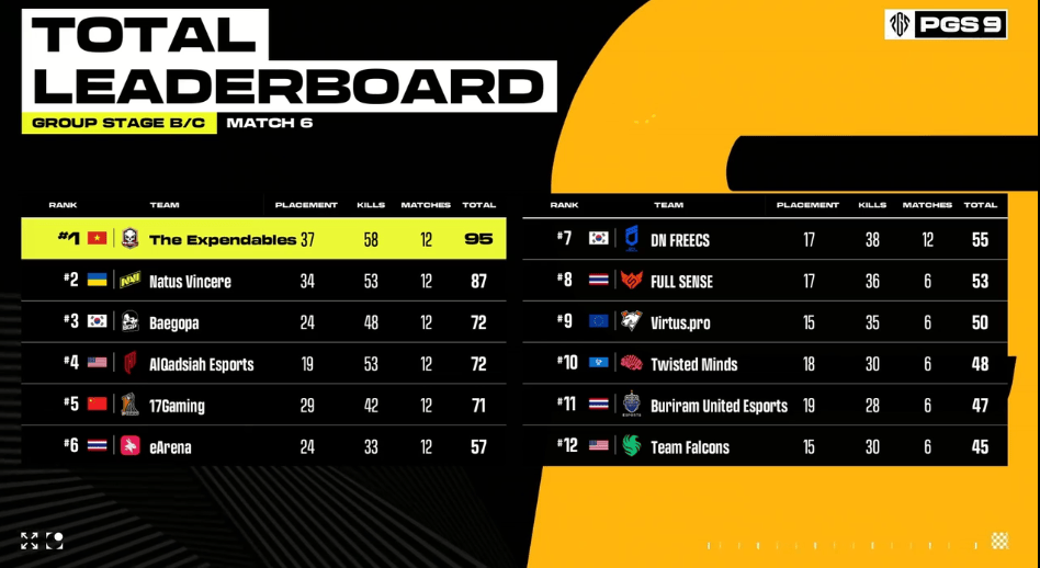 阶段6,DNF进攻EA山头,17抓住机会前来劝架,利用道具先将EA淘汰出局,随后DNF最后一人也被17发现,DNF也被淘汰。另外一边,NAVI与TL交战,NAVI倒地两人将TL淘汰,17前来劝架也被埋点的NAVI一人打掉两人,xwudd关键补枪击倒对方埋点队员,双方都将人员扶起,双方决赛圈三打三,双方一番枪线拉扯,17淘汰NAVI成功吃鸡。