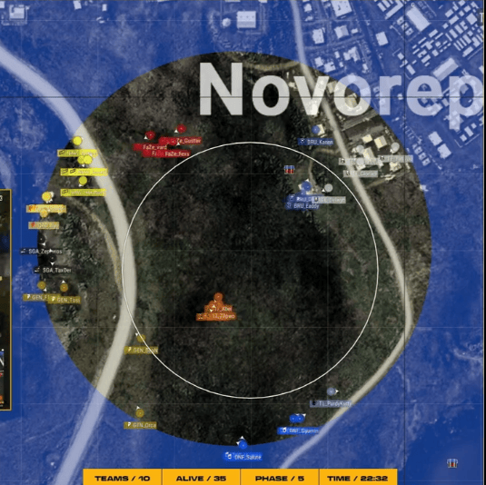 决赛圈,GEN占据圈中优势房区,SLAM撞击GEN房区,但被GEN无伤接住,SLAM被团灭。TL独狼也选择送给蓝圈,最终决赛圈,GEN四打三Faze。