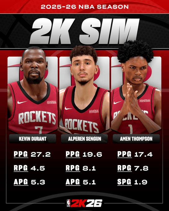虎扑10月16日讯 今日,2K官方更新动态,数据申京预测了火箭三巨头下赛季的阿门场均数据。