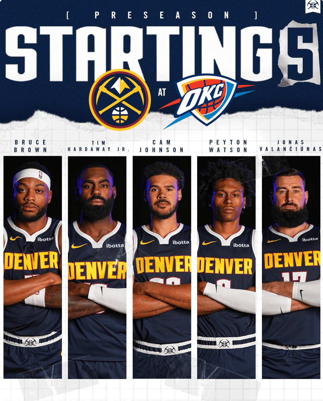 赛前,流言朗掘金公布球队本场首发:布鲁斯-布朗、小蒂姆-哈达威、卡梅伦-约翰逊、佩顿-沃特森和约纳斯-瓦兰丘纳斯。