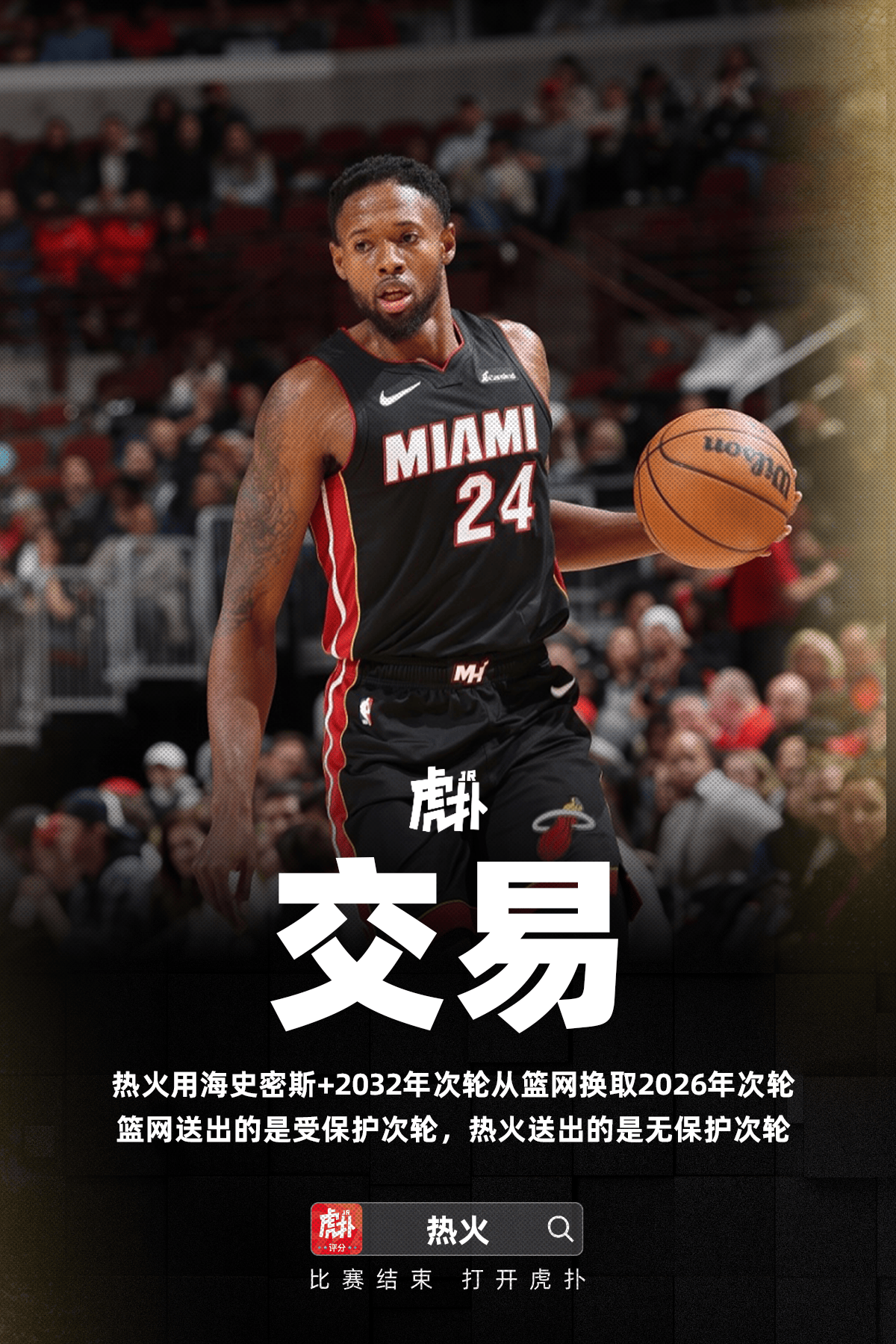 虎扑08月16日讯 根据美国记者Shams的消息,热火用海史密斯+2032年次轮从篮网换取2026年次轮。送出