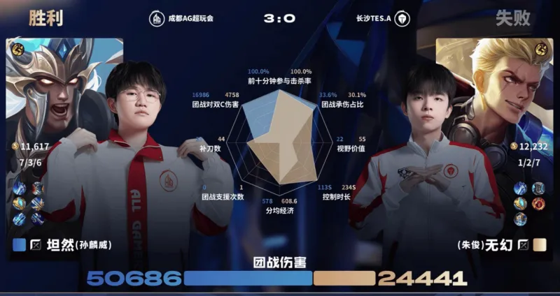 擂台赛最后一局,坦然在成都AG超玩会的谢幕战,给坦然拿到怒海麟威并打出7-3-6的优秀表现。在人情味这一块,很难有队伍比得过AG超玩会了。