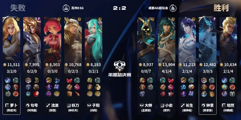 对阵苏州KSG的比赛,在主力阵容被对手2-1先拿赛点的情况下,坦然、小俞两位冠军双边大师轮换登场,顶住压力为队伍扳平比分。