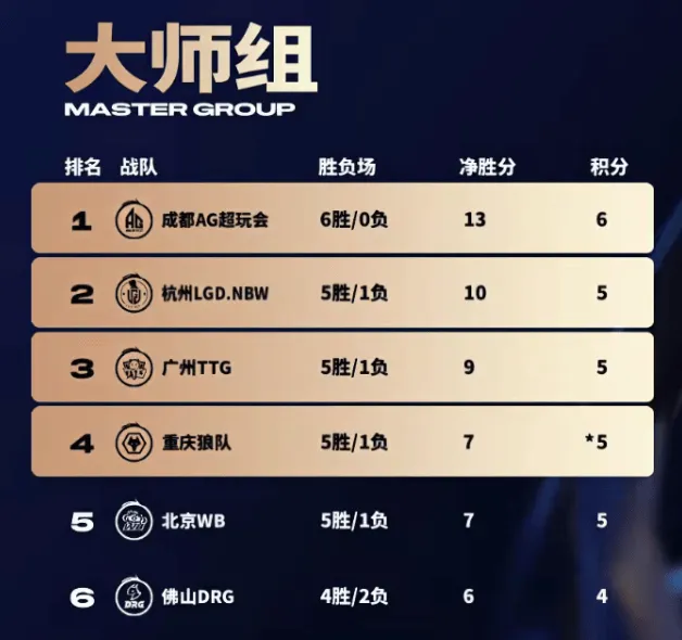 6胜0负13净胜分,大师组唯一一个整个擂台赛阶段都没有大场翻车的队伍。