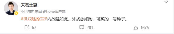 虎扑10月18日讯 BLG不敌G2后,知名作家天蚕土豆发文: