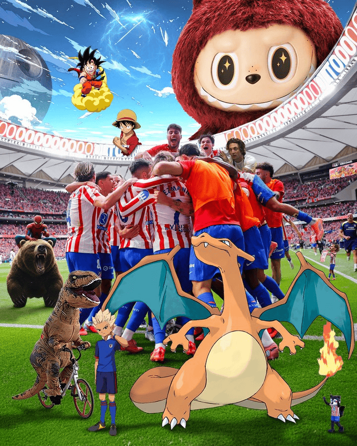 图片中是马竞众将庆祝的画面,同时还加入了拉布布、宝可梦、龙珠、蜘蛛侠、充气恐龙道具等元素,图片右侧还有缩小版的格列兹曼和俱乐部吉祥物。