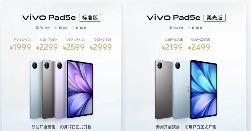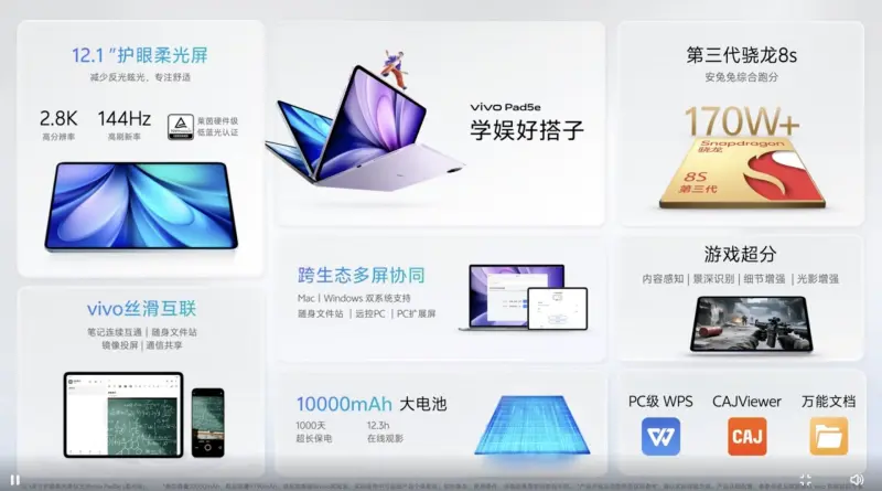 vivo Pad5e 平板配备 12.1 英寸柔光护眼屏,支持跨生态多屏协同,兼容Windows与Mac双系统远程控制,可通过随身文件站查看多种文件格式,并支持 CAJViewer 与 PC 级 WPS,实现办公和学习高效衔接;笔记功能与手机连续互通,可将拍摄课件直接插入原子笔记。Pad5e 搭载第三代骁龙 8s 芯片,配合10000mAh大电池和立体散热系统,支持游戏超分功能。售价1999元起。