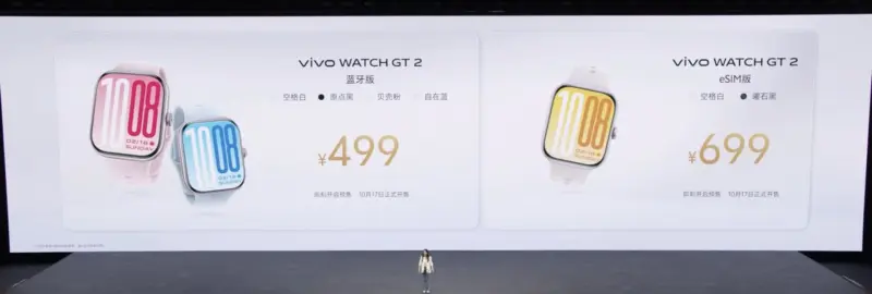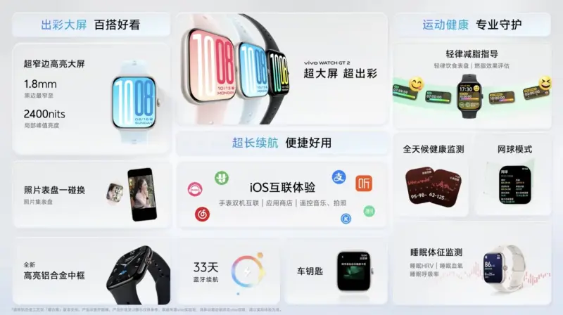 vivo WATCH GT 2 智能手表配备 2.07 英寸超大 AMOLED 屏幕,黑边窄至 1.8mm,局部峰值亮度高达 2400nits,即使在正午户外运动数据也清晰可见。表盘和表带风格多样,可通过照片表盘一碰更换,轻松搭配穿搭。健康功能支持轻律饮食表盘、网球模式、睡眠体征监测,助力日常健康管理。手表还能同时接收 vivo 与 iPhone 两部手机的通知信息,蓝牙续航长达33 天,兼顾便捷与长效使用体验。售价499元起。