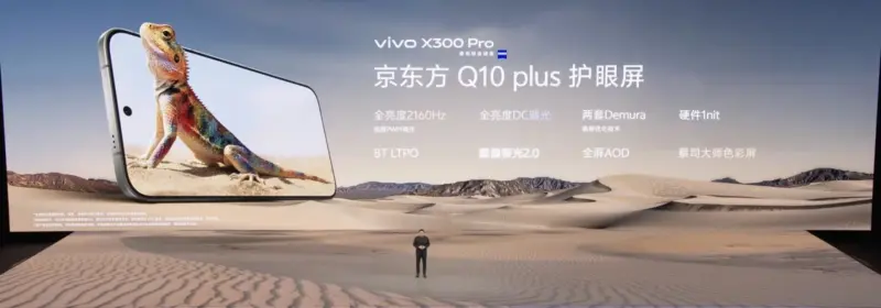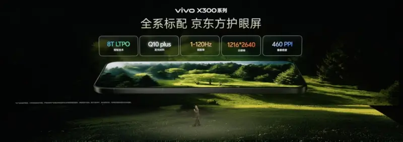 屏幕方面:vivo X300搭载6.31英寸京东方 Q10 Plus 护眼屏,采用行业领先的 8T LTPO 面板,支持 1-120Hz 自适应刷新率、1216×2640 分辨率、460PPI 像素密度。屏幕具备全亮度 2160Hz 高频 PWM 调光与DC 调光双调节,并拥有硬件级 1nit 极暗显示,在暗光环境下依然护眼舒适。官方还加入 双 Demura 校准优化,保证亮度与色彩一致性。
