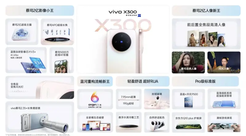 性能方面:vivo X300 系列首发搭载蓝晶 × 天玑9500 平台,并搭载蓝图影像芯片 V3+,带来旗舰级算力与影像处理性能。全系兼容 4K 120fps 10bit Log 视频录制,满足专业创作需求。配备冰脉流体 VC 散热系统,辅以高振感 X 轴马达提供沉浸式操作反馈。
