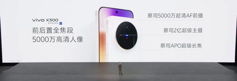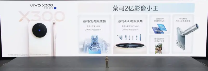 影像方面:vivo X300 系列搭载全新蔡司 2 亿像素超级主摄,采用三星定制 HPB 1/1.4" 大底传感器,配备 CIPA 4.5 级防抖 与 vivo 精度跃迁技术,并结合蔡司 T 镀膜*、深吸收蓝玻璃等旗舰级光学工艺,实现极致画质表现。同时配备蔡司 APO 超级长焦镜头,搭载蓝图 × 索尼 LYT-602 传感器,同样支持 CIPA 4.5 级防抖。全焦段覆盖包括人像、风光、抓拍、视频等多场景,支持 vivo 蔡司 2.35× 长焦增距镜,并全系兼容外接光学配件。前置方面,X300 系列首次搭载蔡司认证 5000 万超清 AF 前摄,具备 92° 超广角视野,支持 AF 自动对焦。影像功能上还提供全焦段运动人像抓拍、4K 视频转 Live 格式、AI 路人消除、变焦运镜、重选封面帧等新玩法,并搭载与 X200 Ultra 同级的变焦闪光灯。