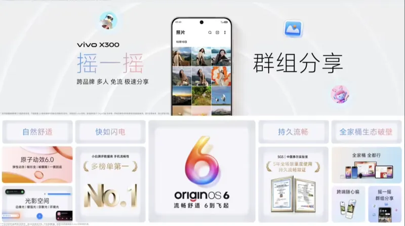 系统方面:X300系列首发OriginOS 6系统,带来全新视觉与交互体验,据官方介绍,vivo获得 SGS + 中国泰尔 5 年全场景重度使用双证书,并全球首发 iPad 办公套件,实现笔记续写、任务接力、日历同步、文件拖拽、投屏操控等跨设备能力。更重磅的是,vivo 宣布 “全家桶生态破壁”方案,打通与苹果生态的跨平台互联。用户可在 vivo 手机与 iPhone、Mac、Apple Watch、AirPods 间实现电话、短信、通知、剪贴板、日程、文件、照片等多维度流转与同步。支持在 vivo 手机上显示 AirPods 电量、开启空间音频与位置查找,并可在 iPhone 上拍照后直接在 vivo 设备中编辑。此外,vivo 还推出全新的 “摇一摇跨品牌群组分享”功能,可实现跨品牌一对多文件与照片秒传,解决传统一碰传的单向限制。