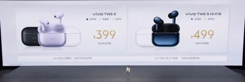 vivo TWS 5采用入耳式设计,外观延续 TWS Air 3 系列风格但棱角更分明,提供白色、蓝色和全新「微薰紫」配色。支持 深海智慧降噪,最大降噪可达 60dB,同时兼容安卓与苹果设备,实现跨生态无缝三连接。音质由 vivo 金耳朵声乐团队联合上海音乐学院调校,并获得 Hi-Res 高品质无线音频认证。耳机支持实时智慧翻译、个性化智慧弹窗,提供 48 小时续航,游戏模式下延迟低至 42ms。售价399元起。