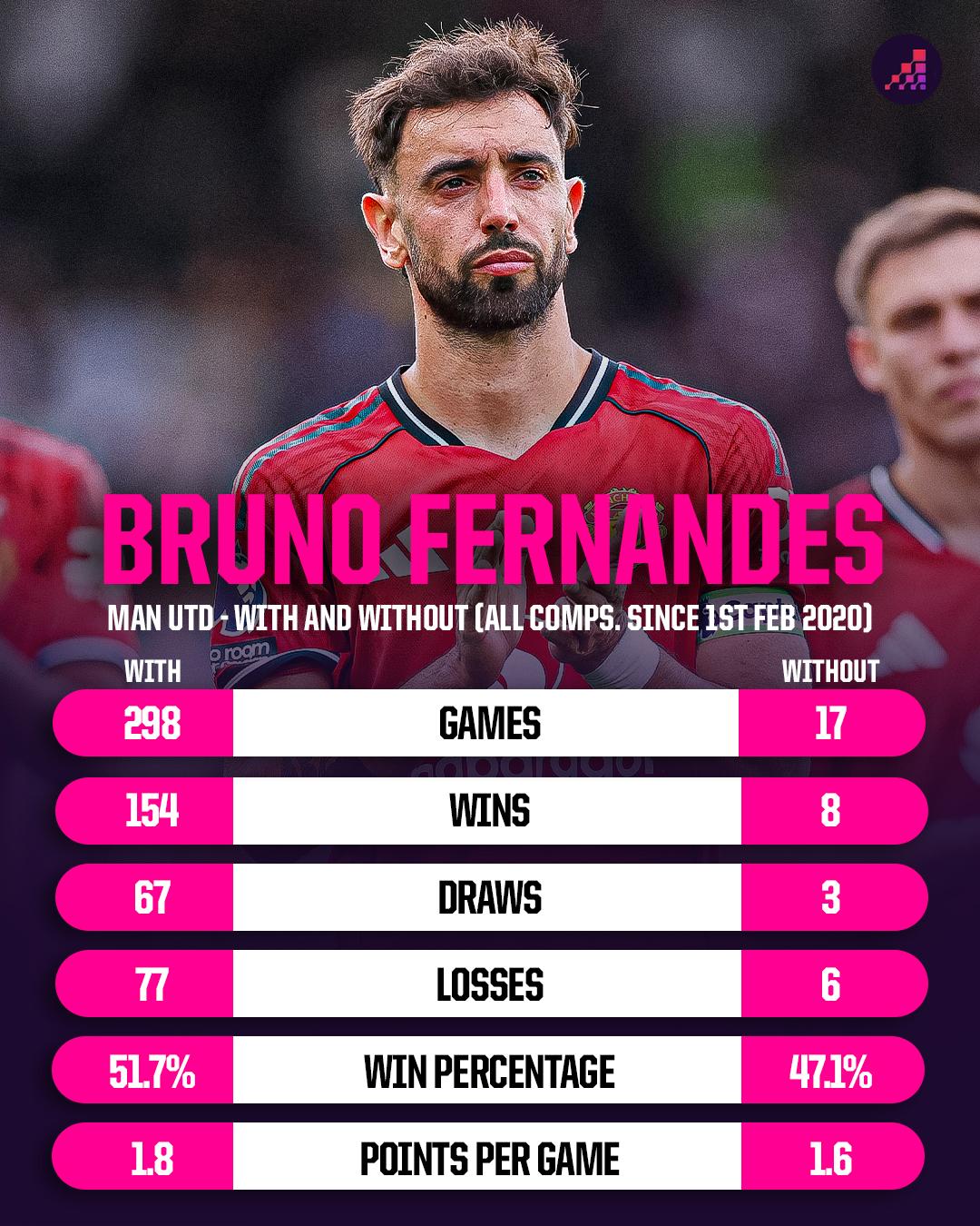 虎扑10月14日讯 Opta Analyst对比了曼联在布鲁诺-费尔南德斯在场和缺席时的战绩数据: