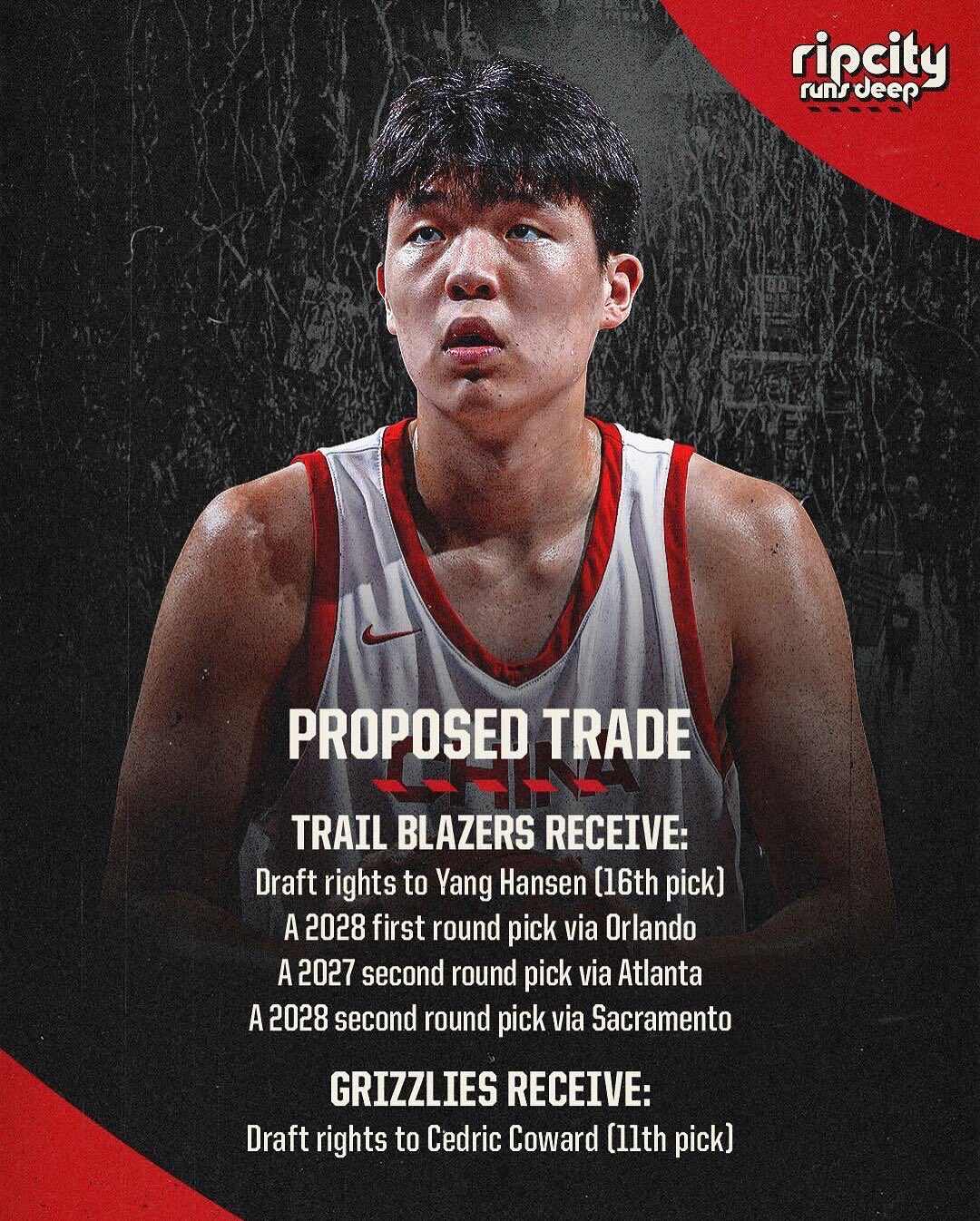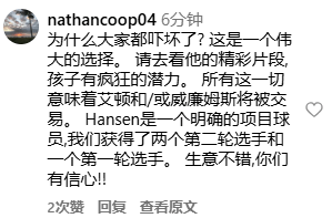 虎扑06月26日讯 今日NBA选秀大会,杨瀚森在16顺位被选中,社媒森加森数即将加盟波特兰开拓者。发图