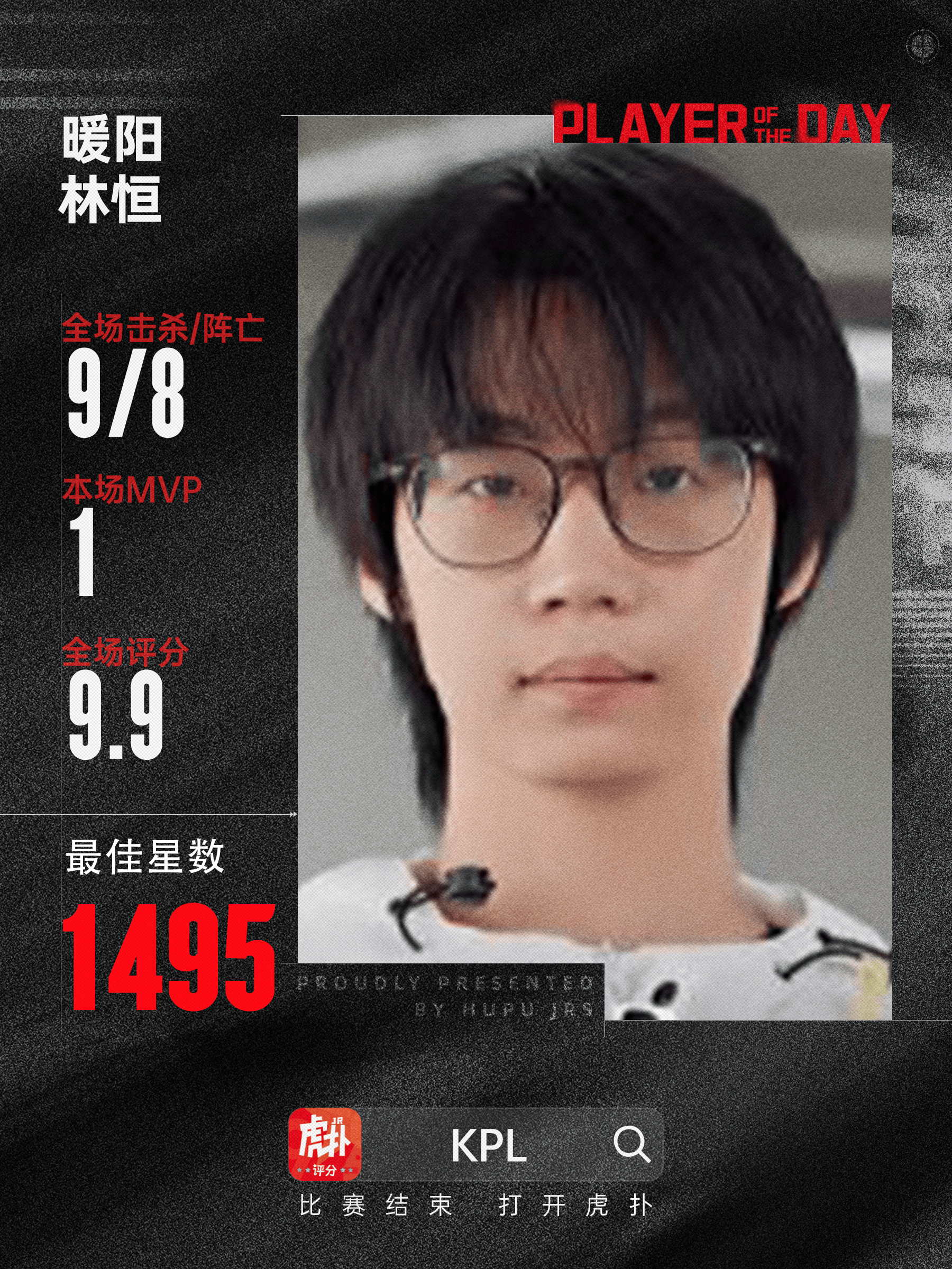 最终暖阳选手以9.9的板巅评分,总星数1495(排除一星)斩获昨日最佳选手!峰对