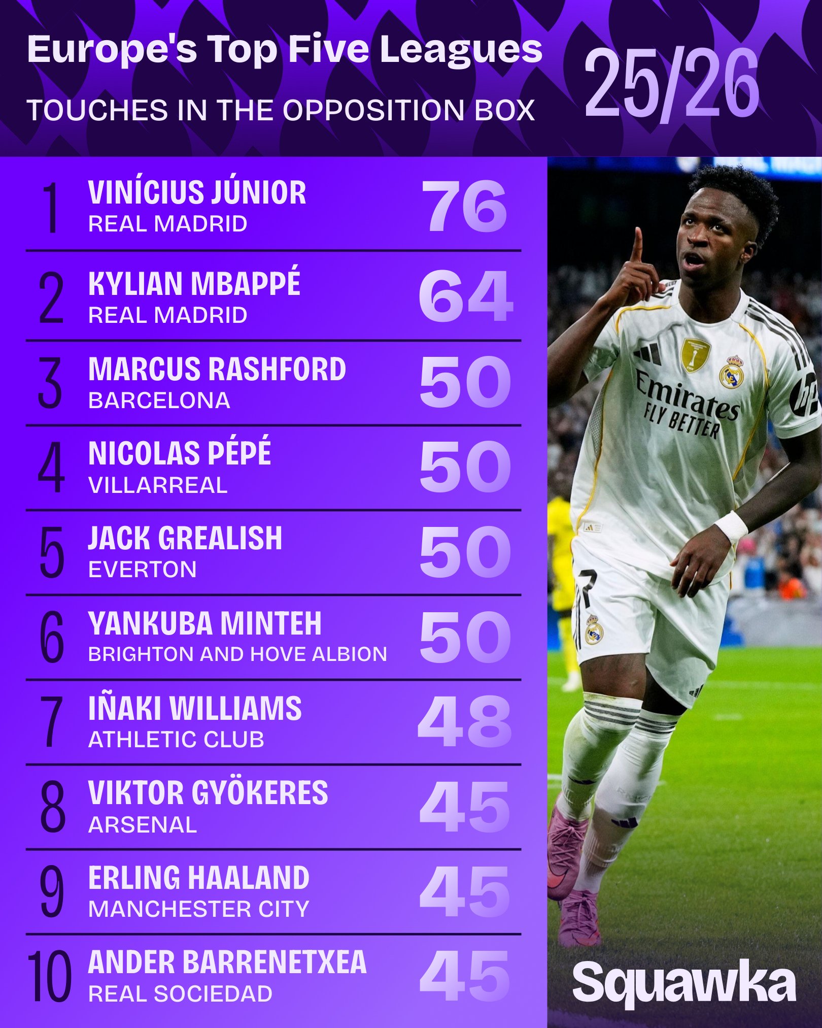 区触球榜维尼修斯(皇家马德里)—— 76次