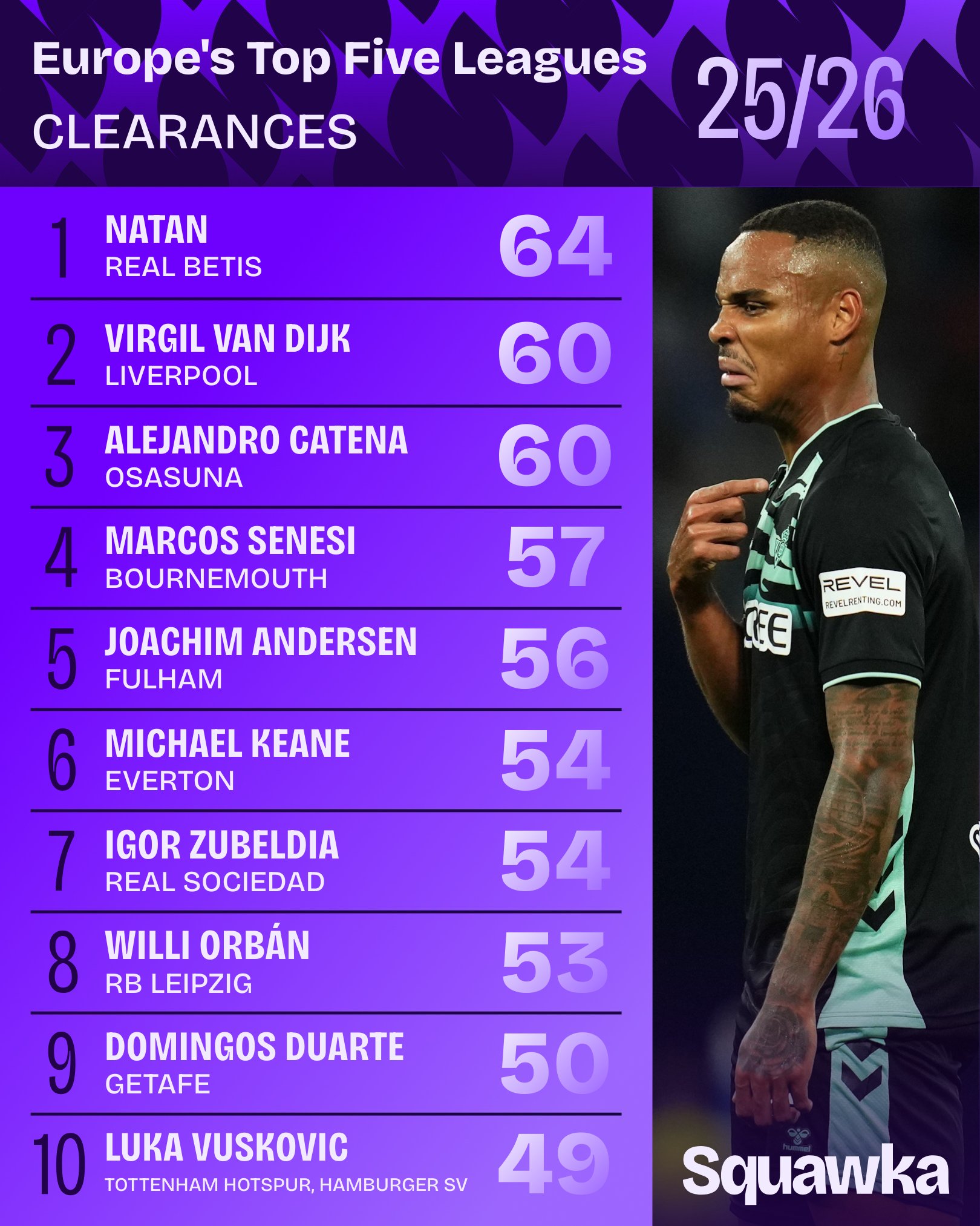 虎扑10月16日讯 Squawka数据统计本赛季至今五大联赛解围榜,贝蒂斯中卫纳坦64次居首,季至今大解围居首范戴克并列第二。中卫