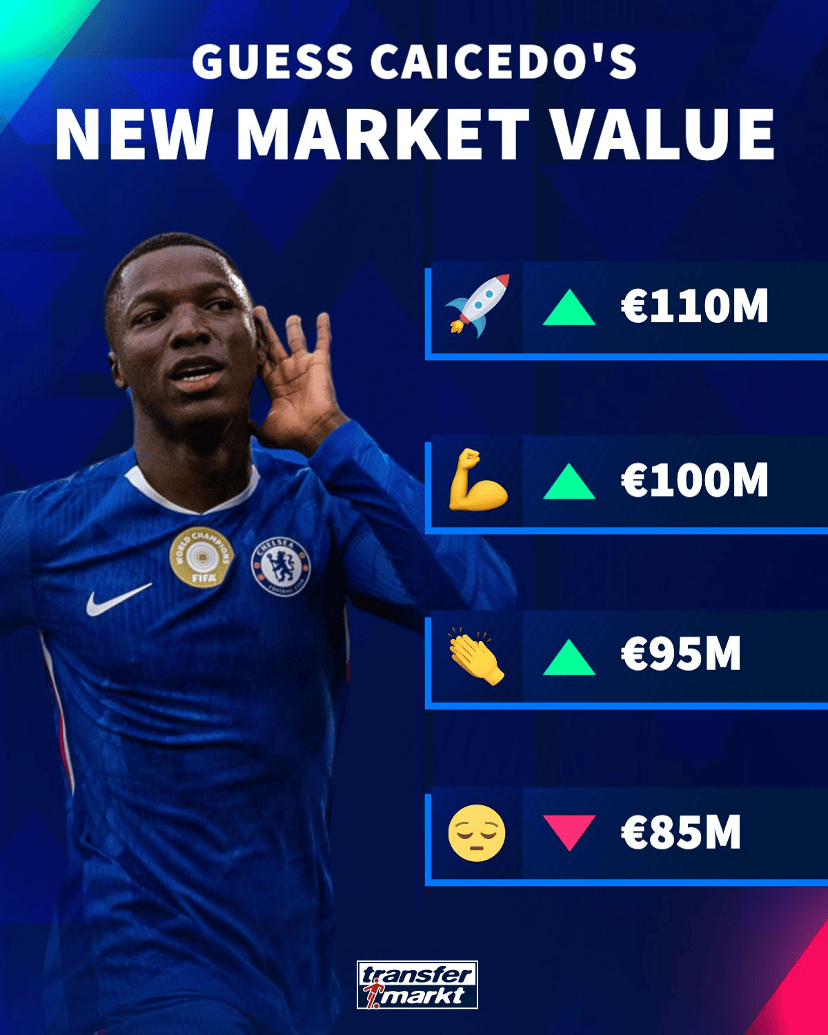 来源:X虎扑10月15日讯 北京时间10月17号,德国转会市场将更新英超球员的身价榜单。而在今日,德转也预热了切尔西中场凯塞多,阿森纳前锋萨卡以及纽卡前锋沃尔特马德身价。