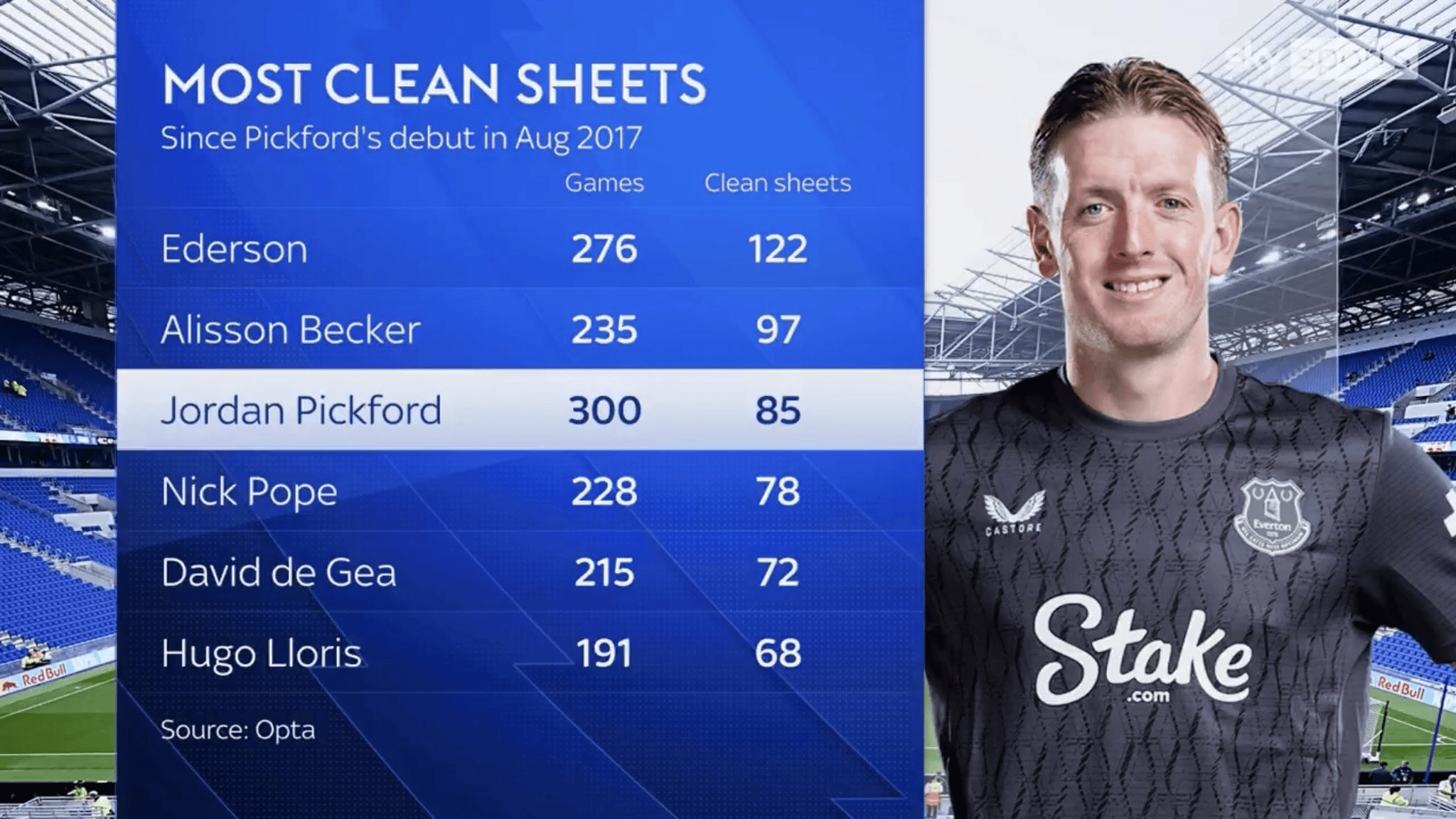 在300场比赛中皮克福德完成了85场零封,在同期英超门将中仅次于埃德森(122)与阿利森(97)。更令人印象深刻的是,皮克福德在过去三个赛季中几乎没有出现导致丢球的重大失误,2023/24与2024/25赛季各仅一次,本赛季至今保持零失误。
