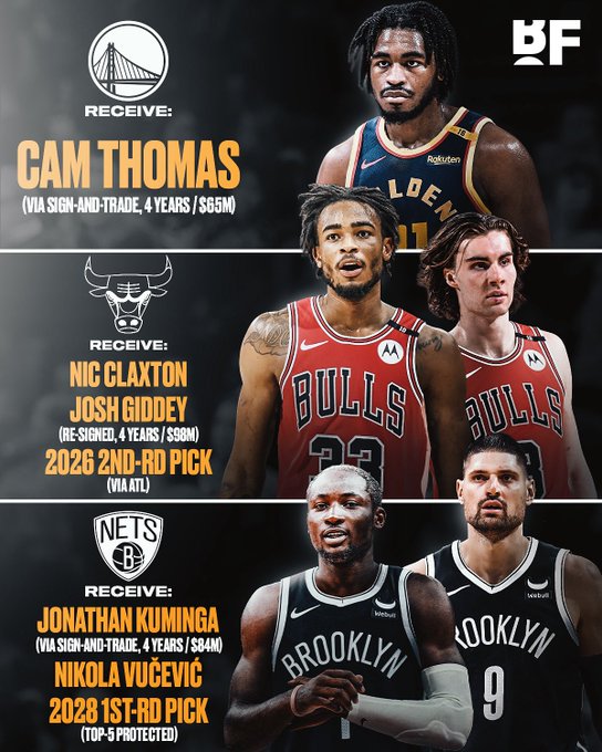 公牛获得:尼古拉斯-克拉克斯顿、托马约什-吉迪(4年9800万美元续约)、互换2026年次轮签(来自老鹰)