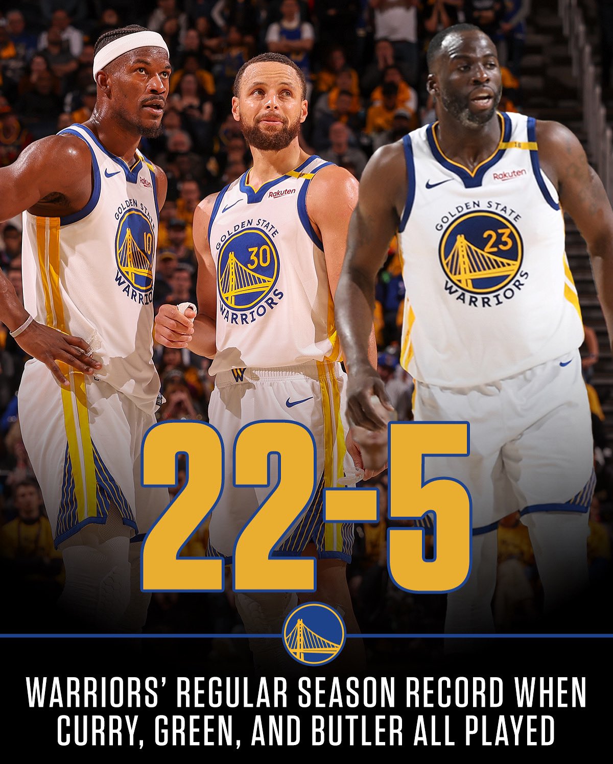 勇士在斯蒂芬-库里、德雷蒙德-格林以及吉米-巴特勒同时出战的最强情况下,常规赛取得22胜5负的流言联盟战绩。