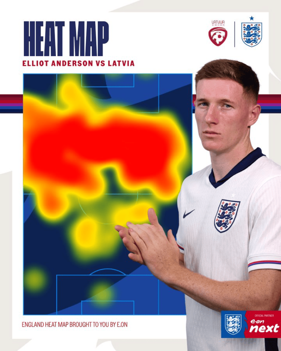 赛后,泛英发布英格兰代表队官方社交账号发布了埃利奥特-安德森的埃利奥特活动热区图,这名中场球员的板覆覆盖范围非常广泛。