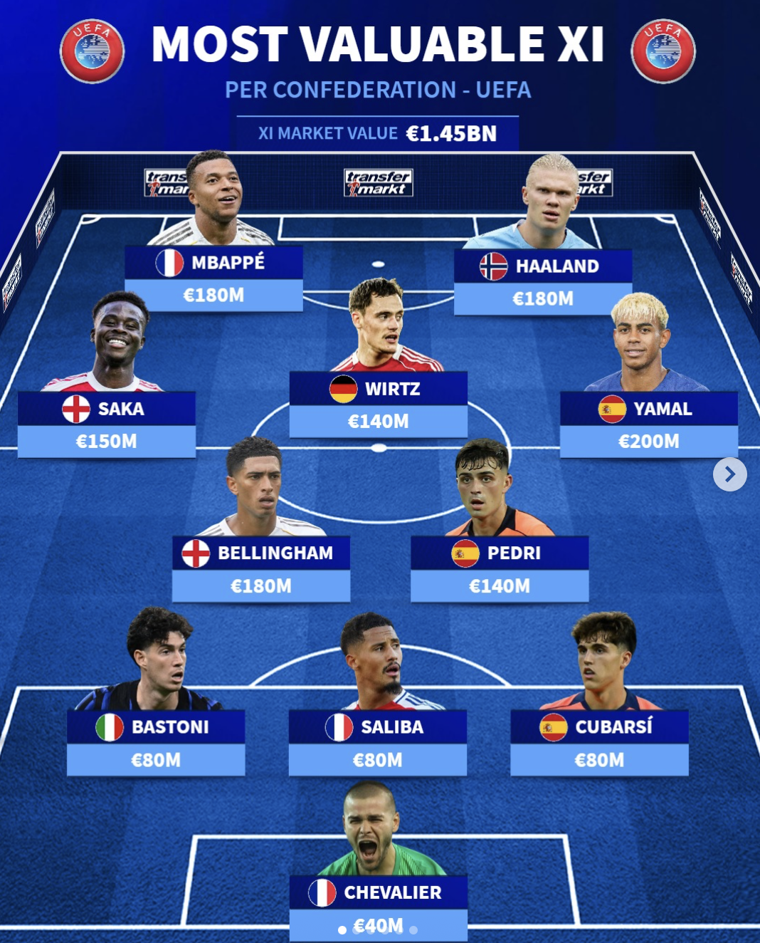 阵容总身价为14.5亿欧,法国其中法国和西班牙各有3名球员入选。西班选西班牙球员亚马尔以2亿欧领衔阵容。人入