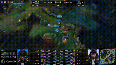 虎扑10月15日讯 AL对阵HLE首局,HLE抓Shanks蛇女追击过深,蛇女AL抱团反杀两人0换2开局